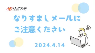 おしらせ 「なりすましメール」にご注意ください 「なりすましメール」にご注意ください現在、サポステや厚生労働省等を装った不審なメール(なりすましメール)が、複数確認されております。万が一、不審メールを受信した場合は、添付ファイル等を決して開かずメールごと削除してください。ご心配・ご迷惑を... おしらせ